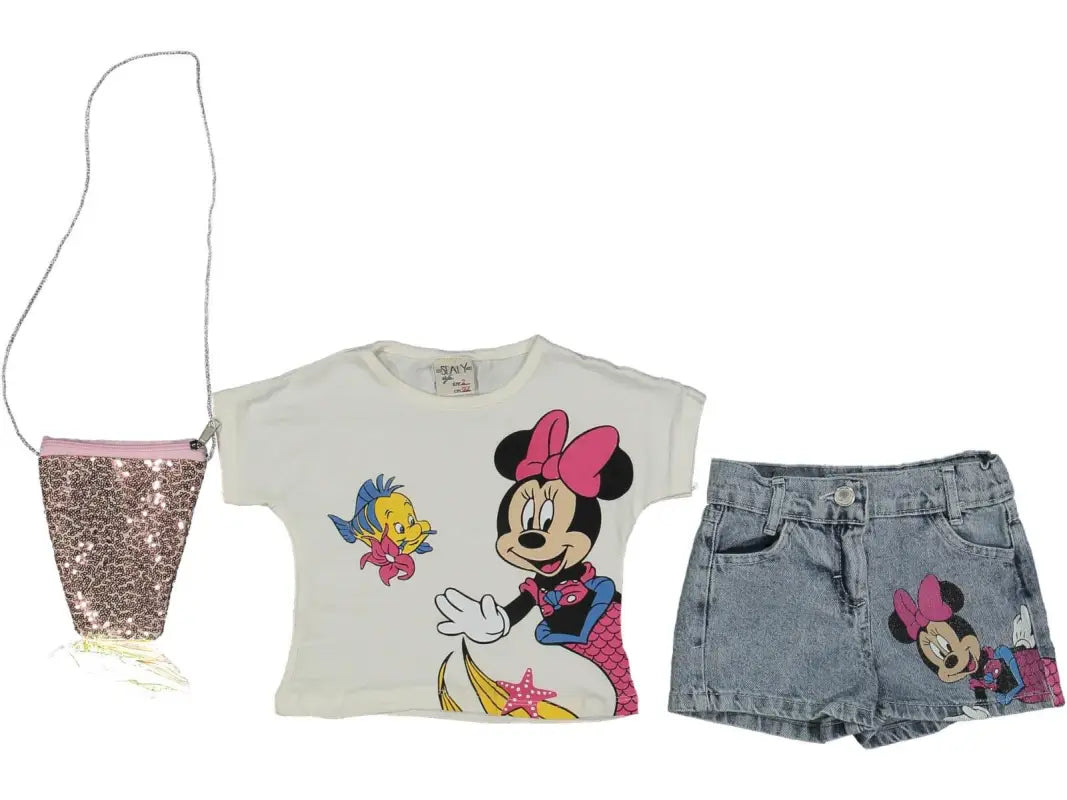 Kız Çocuk Mickey Mouse Baskılı Kot Şortlu Çantalı 3lü Takım