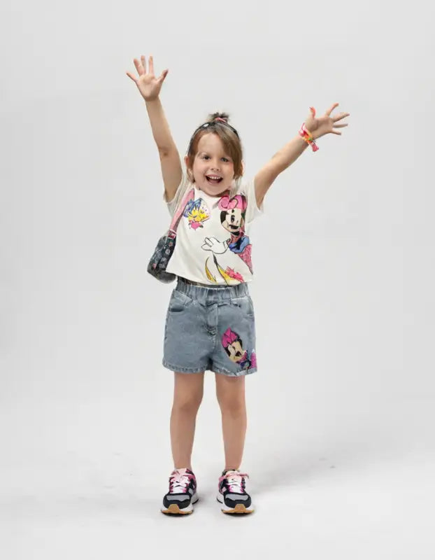 - Şıklık: Mickey Mouse figürleri ve kot şortun klasikleşmiş tarzı, kızınıza şık bir görünüm kazandırır.