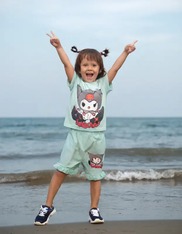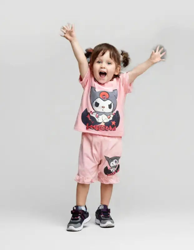 Enerjik sarı rengi ve sevimli Kuromi karakter baskısıyla öne çıkan bu kız çocuk şortlu takım, miniklerin yaz mevsiminde rahatça hareket edebilmesi için %100 pamuk penye kumaştan üretildi. Nefes alan dokusu sayesinde terletmez; kısa kollu tişört ve lastikli şort kombinasyonu, hem oyun parkında hem de tatilde konforlu bir stil sunar. Eğlenceli tasarımıyla kızınızın gardırobuna renk katacak bu lisanslı takım, 3-6 yaş arası çocuklar için idealdir.
