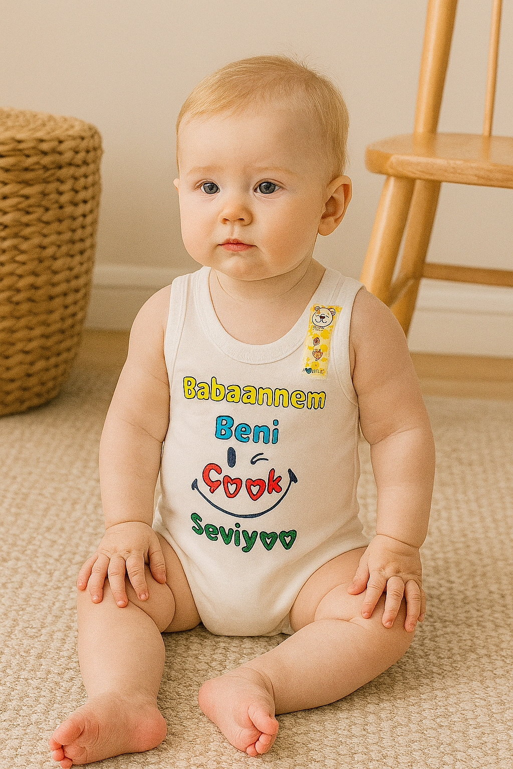 Bebeğinizin sevimliliğine sevimlilik katacak, %100 pamuklu “Babaannem Beni Çok Seviyor” yazılı kolsuz body ile tanışın! Yumuşacık dokusu sayesinde hassas tenlere tam uyum sağlayan bu atlet yaka body, nefes alabilir penye kumaşıyla dört mevsim rahatlık sunar. Renkli ve dayanıklı baskısıyla ilk günkü canlılığını korurken, alttan çıtçıtlı tasarımı sayesinde alt değiştirme işlemlerini anneler ve babalar için çok daha pratik hale getirir. Unisex ekru rengiyle hem kız hem erkek bebek kombinlerine kolaylıkla uyum sağlar; baby shower, hastane çıkışı veya ilk yaş hediyesi olarak da harika bir tercihtir.