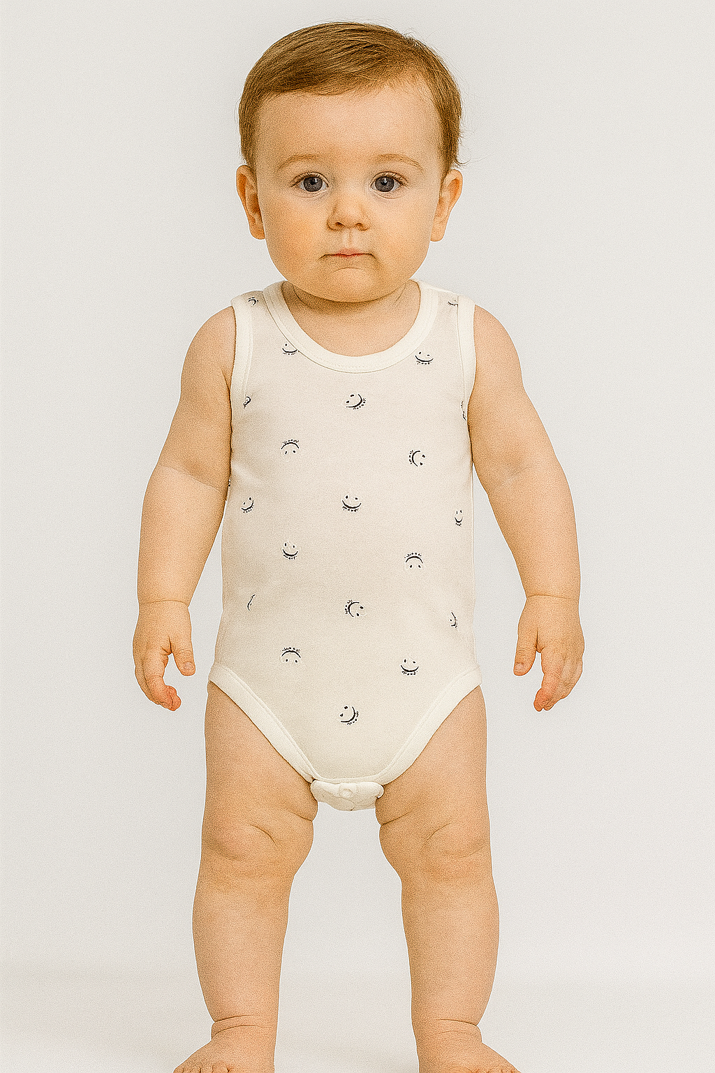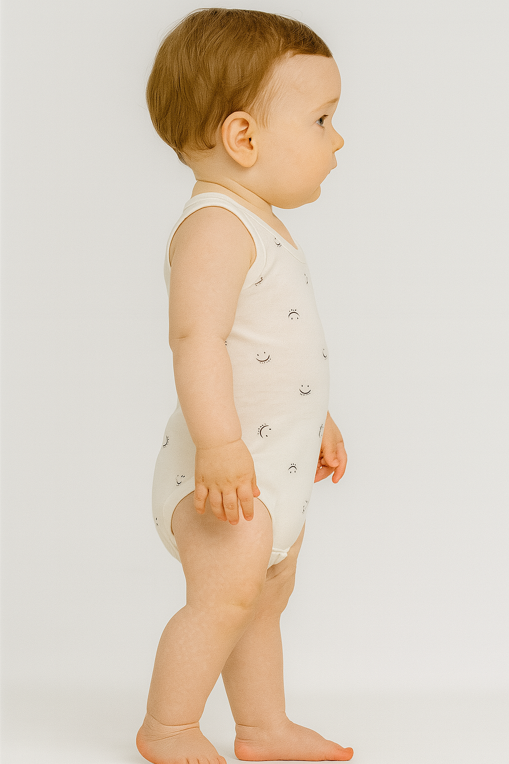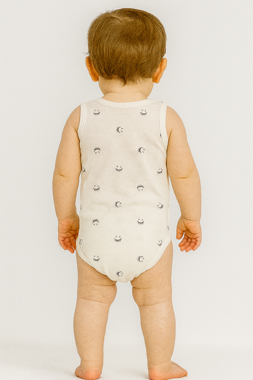 Bu ekru bebek body, minimal ay ve sevimli gülümseyen yüz desenleriyle bebeğinizin gardırobuna neşeli bir dokunuş katar. %100 pamuklu yumuşak kumaşı sayesinde hassas ciltlere dosttur; nefes alır, terletmez. Kolsuz tasarım yaz aylarında serinlik sunarken, alttaki çıtçıt kapama pratik alt değiştirme imkânı sağlar. Zararlı madde içermeyen OEKO‑TEX® Standard 100 sertifikalı boyalarla üretilmiştir. Günlük kullanım ve şık kombinler için ideal olan bu çıtçıtlı tulum, 0‑12 ay arası tüm bebekler için konfor ve tarzı bir araya getirir.