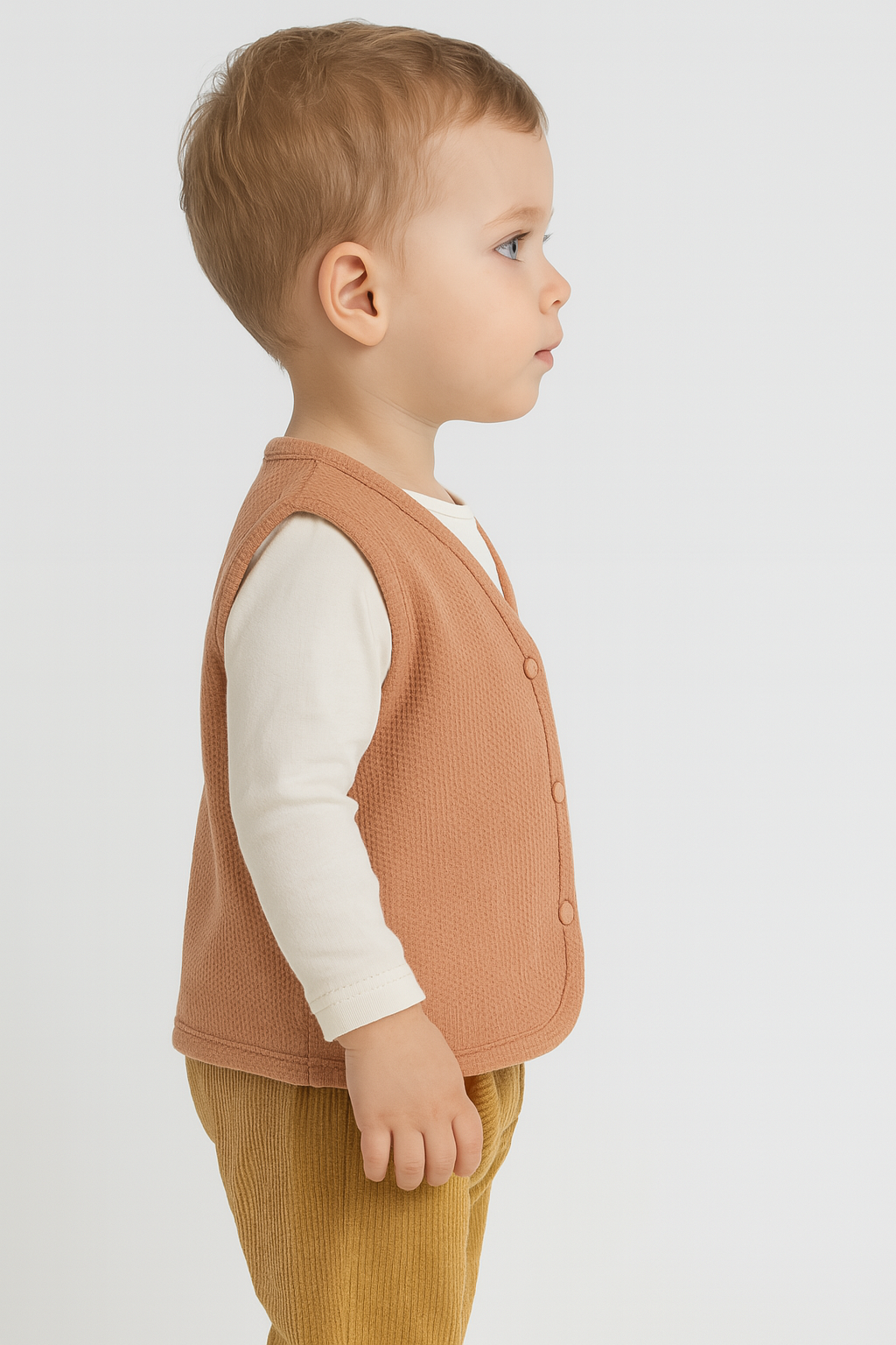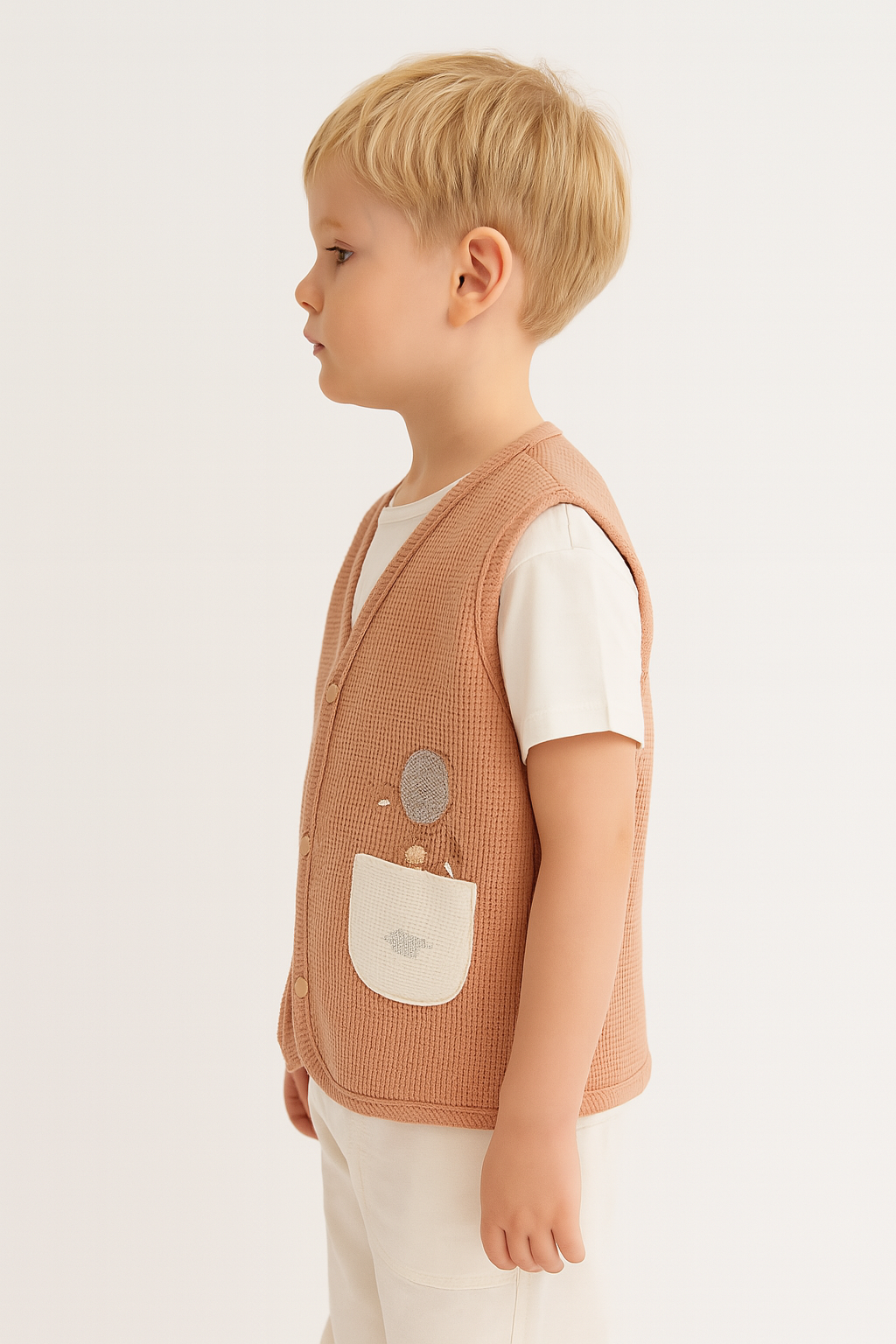 Aradığınız yelek, hem şık hem de rahatlığıyla öne çıkan bir parça gibi görünüyor. Unisex waffle kumaş yapısıyla hem erkekler hem de kadınlar tarafından rahatlıkla tercih edilebilir. Önden çıtçıt kapaması hem kullanımı kolaylaştırır hem de modern bir görünüm sağlar. Cep detayları ise hem şık bir dokunuş katar hem de küçük eşyalarınızı taşımak için pratik bir çözüm sunar.