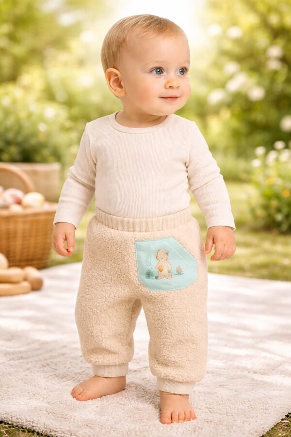Erkek Bebek Beli Lastikli Kanguru Cepli Ayıcık Baskılı Peluş Alt Pantolon nasıl bir kumaştan üretilmiştir?