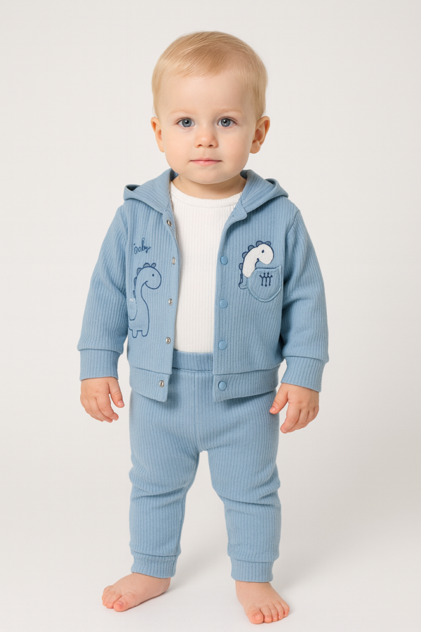 Ürün Adı Önerisi: Erkek Bebek Dinozor Baskılı 3'lü Kapüşonlu Alt Üst Takım - Mavi