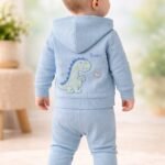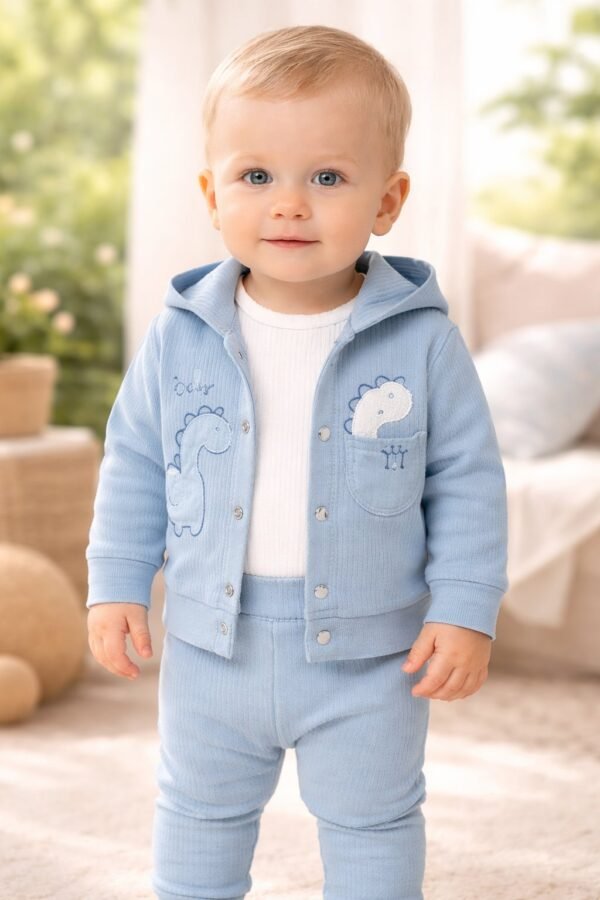Kapüşonlu Ceket: Önden çıtçıtlı, üzerinde sevimli dinozor figürleri bulunan mavi hırka/ceket.