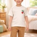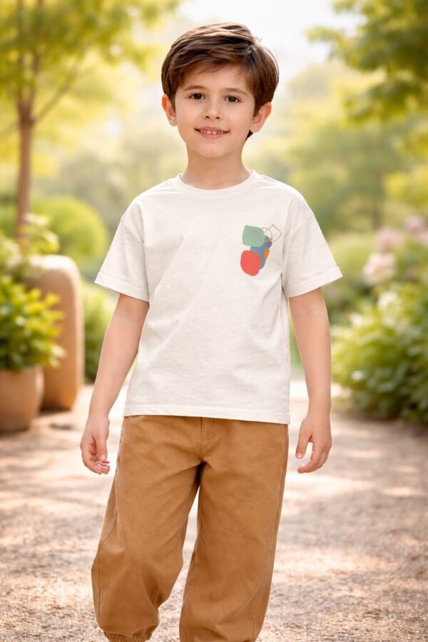 Erkek Çocuk Arkası Desenli – Kısa Kollu Tişörtlü – Keten Pantolonlu Takım