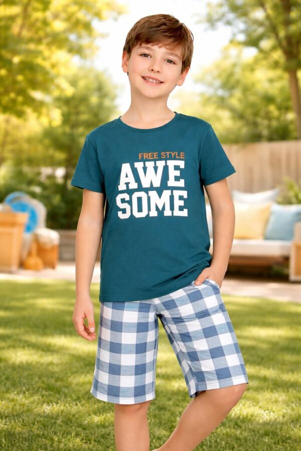 Erkek Çocuk awe some yazılı kısa kollu yeşil renk pijama takımı