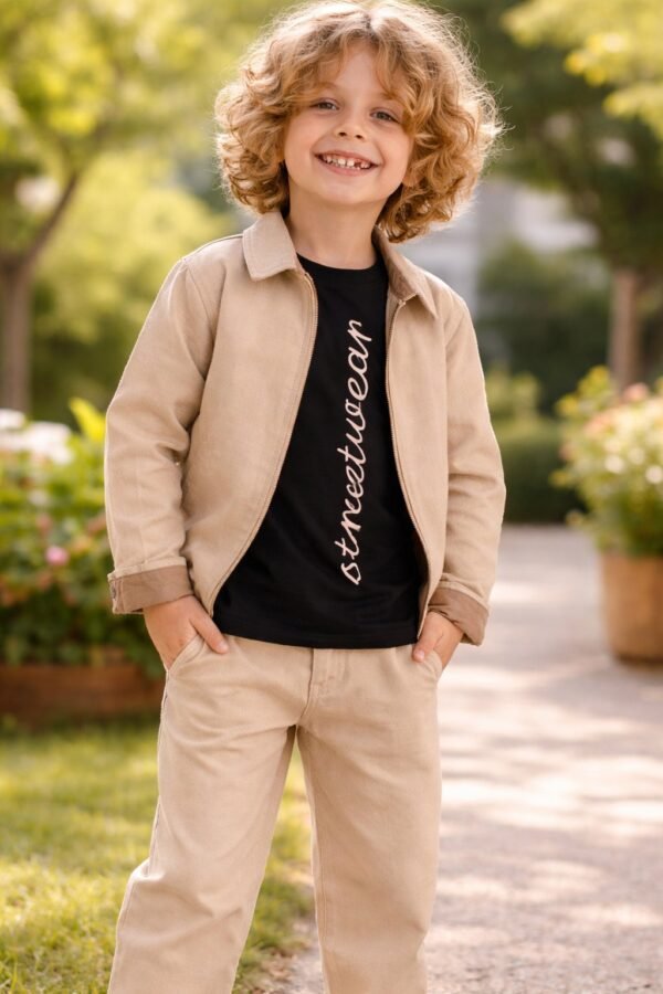 Erkek çocuklar için tasarlanmış, keten kumaştan yapılmış kısa kollu üç parçalık takım. Yaz aylarına uygun hafif ve nefes alabilen yapısıyla çocukların rahat hareket etmesini sağlar.nÜrün, krem renkli pantolon, keten ceket ve kısa kollu tişört içerir. Fermuarlı ceket detaylarıyla şık ve kullanışlı tasarımı bulunur. Günlük kullanıma ve özel etkinliklere uygun, dayanıklı ve kolay bakım özellikleriyle öne çıkar.nBu takım, çocukların hareket özgürlüğünü kısıtlamadan şık görünmesine yardımcı olur. Hafif yapısı sayesinde sıcak havalarda serin kalmasını sağlar. Kız-erkek çocuk giyimi kategorisinde, 4-8 yaş arası çocuklar için ideal seçimdir.