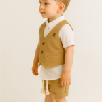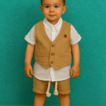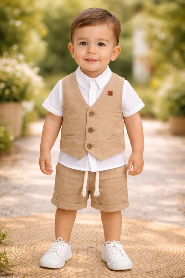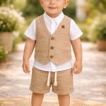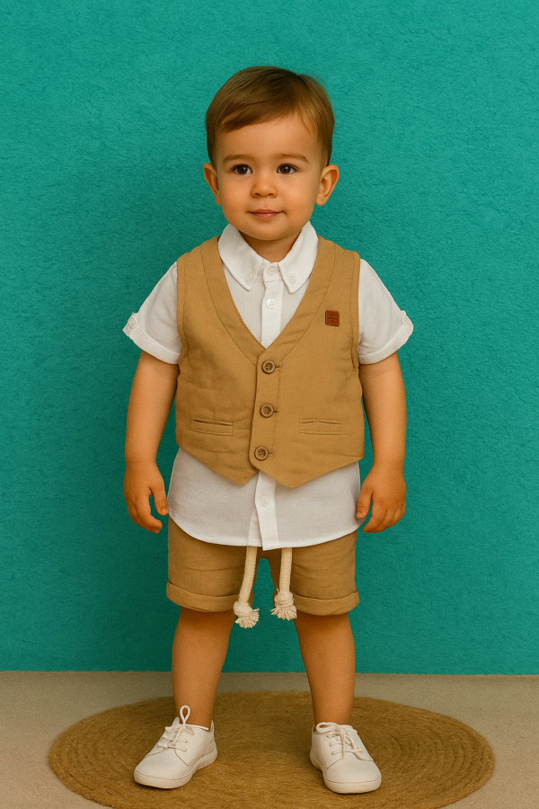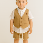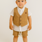 Erkek Çocuk Müslin Kumaş – Kısa Kol Gömlekli – Yelekli – Şort Takım