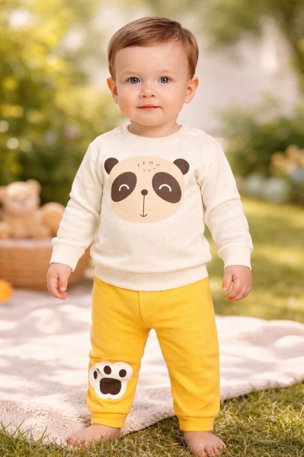 Set İçeriği: 1 adet uzun kollu panda baskılı sweatshirt ve 1 adet pati detaylı eşofman altı