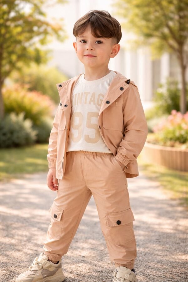 Erkek çocuk paraşüt kumaşlı- gül kurusu - önden çıtçıtlı kapşonlu-kısa kol tişört- bel ve paça kısmı lastikli- pantolonlu 3lü takım