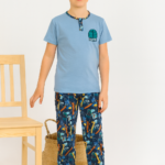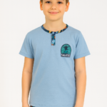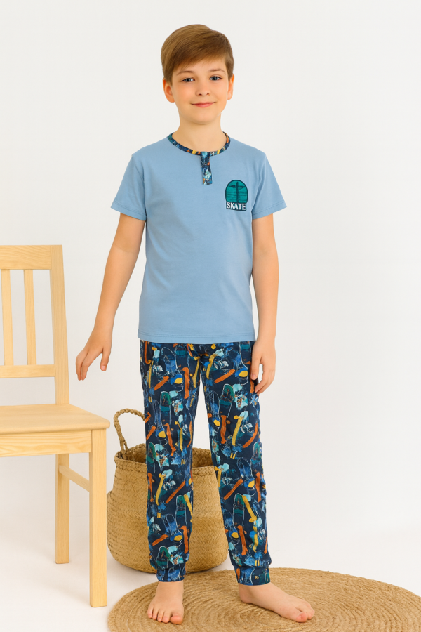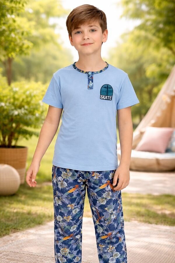 Erkek çocuk skate yazılı kısa kollu pamuklu mavi renk pijama takımı
