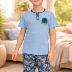 Erkek Çocuk Skate Yazılı Kısa Kollu Pamuklu Mavi Renk Pijama Takımı nasıl bir kumaştan üretilmiştir?