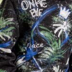 Siyah zemin üzerine canlı mavi, yeşil ve beyaz renklerde soyut grafikler ve metinlerden oluşan "graffiti" tarzı tam baskıya sahiptir.