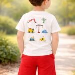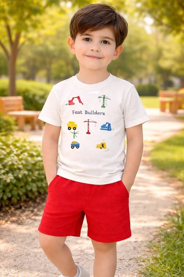 İnşaat Makineleri Desenli Erkek Çocuk Takımı (Beyaz Tişört & Ekru Şort)