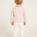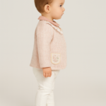 Zarif Tüvit Ceket: Pembe beyaz pötikare desenli tüvit kumaşı, bebe yakası ve ön kısmındaki fırfır detayıyla nostaljik ve şık bir görünüm sunar.