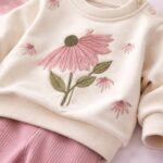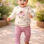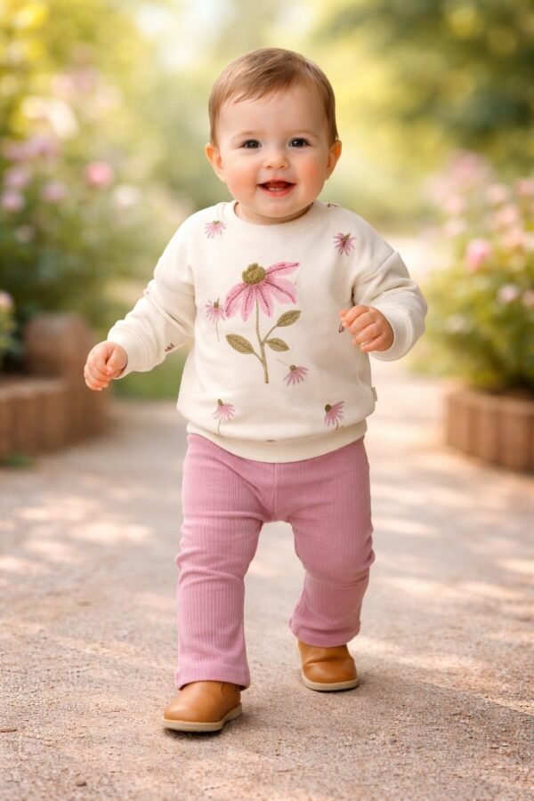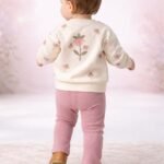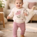 Kız Bebek Çiçek Detaylı- Kadife Taytlı Krem Renk Takım