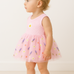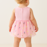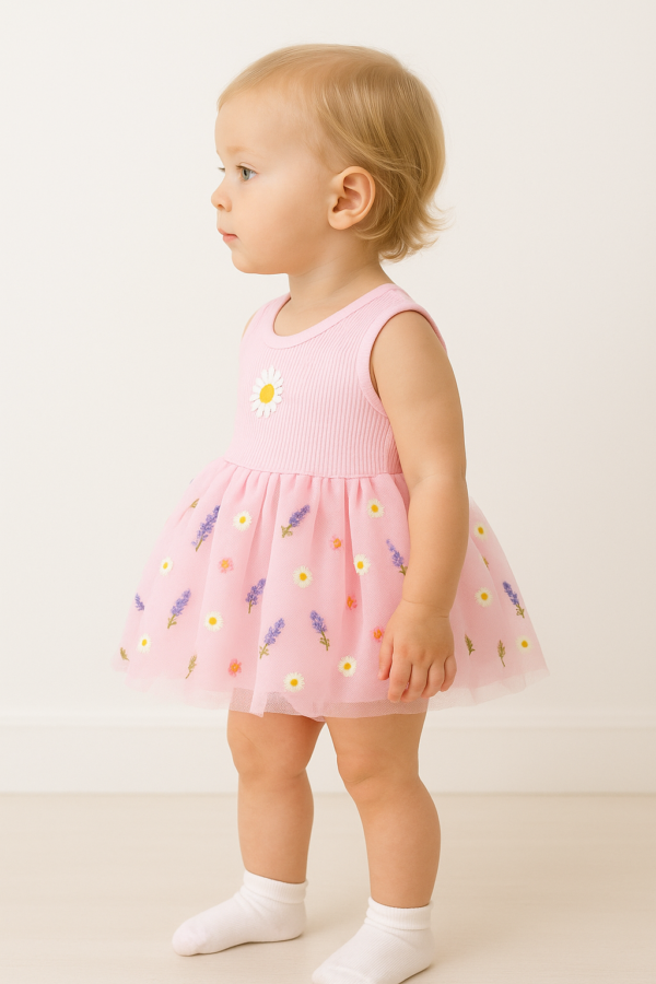 Kız Bebek Çiçek Nakışlı Tüllü Sıfır Kol Pembe Renk Elbise