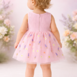 Kız Bebek Çiçek Nakışlı Tüllü Sıfır Kol Pembe Elbise