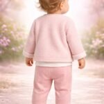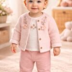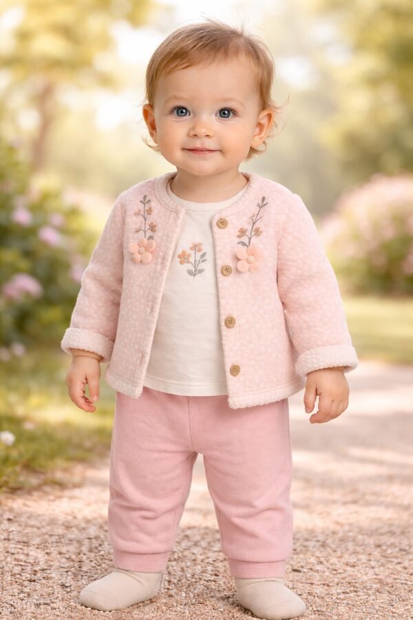 Miniklerin zarafetini tamamlayacak bu 3 parçalı pembe bebek takım, hem şıklığı hem de konforu bir arada sunuyor. Yumuşak dokulu, kendinden desenli triko hırka, ön kısmındaki çiçek nakışları ve zarif düğme detaylarıyla öne çıkarken, takımı tamamlayan beli lastikli pembe bebek pantolonu ve yumuşak dokulu pembe bebek badysi bebeğinizin gün boyu rahat hareket etmesini sağlar. Günlük kullanımın yanı sıra özel günler ve fotoğraf çekimleri için de ideal bir tercihtir.