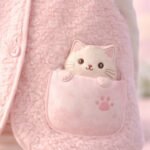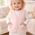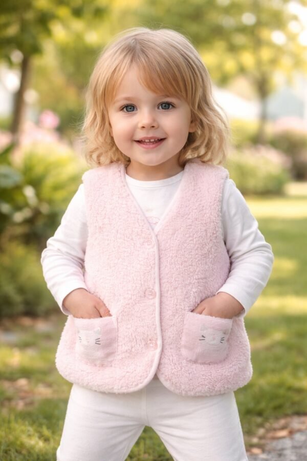 Kız Bebek Düğmeli Kedi Baskılı Cep Organik Peluş Yelek
