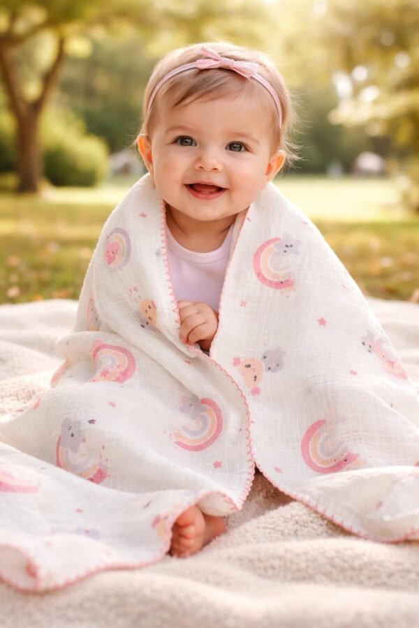 Kız Bebek Gök Kuşağı Desenli Pikeli Müslin Battaniye