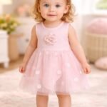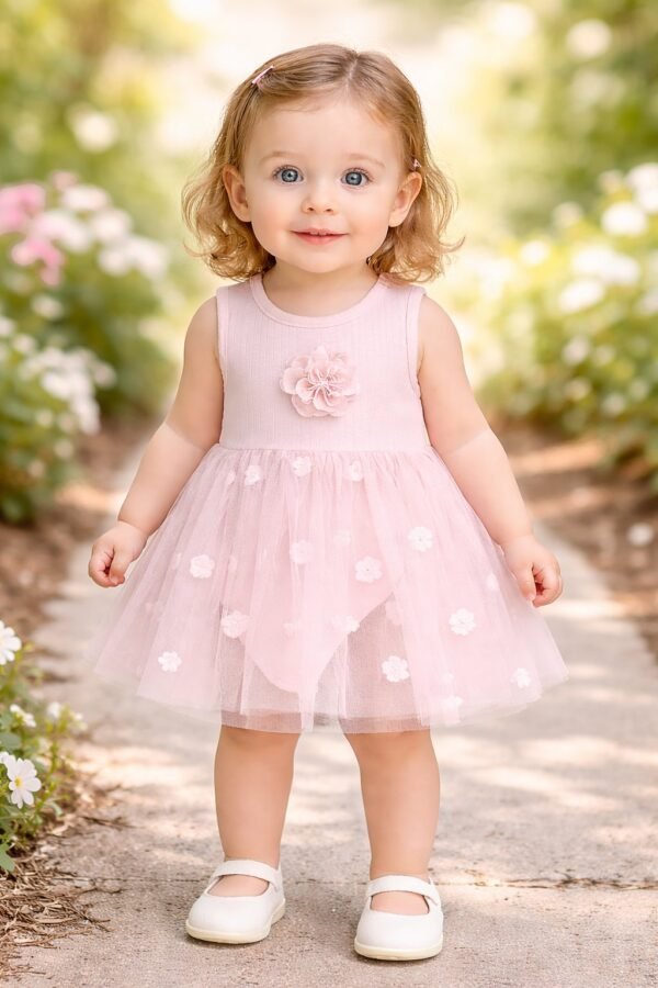 Kız Bebek Gül Işlemeli Sıkır Kollu Çıtçıtlı Pembe Renk Tüllü Elbise