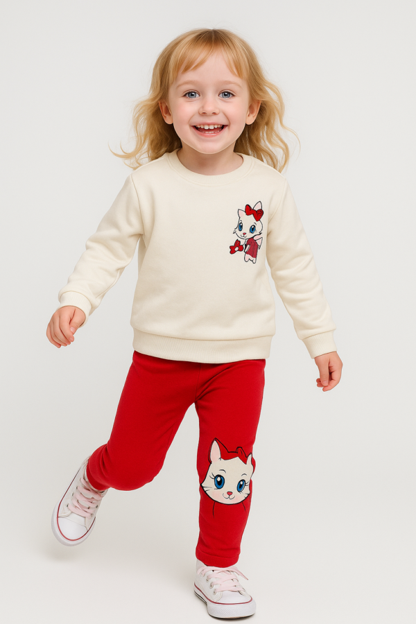 Kız Bebek kedi baskılı -fitilli taytlı-beyaz renk-uzun kollu 2li takım