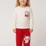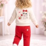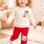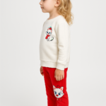 Kız Bebek Kedi Baskılı – Fitilli Taytlı – Beyaz Renk – Uzun Kollu 2li Takım