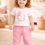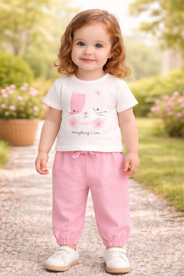 Kız Bebek Kedi Baskılı Keten Pantolonlu Takım