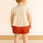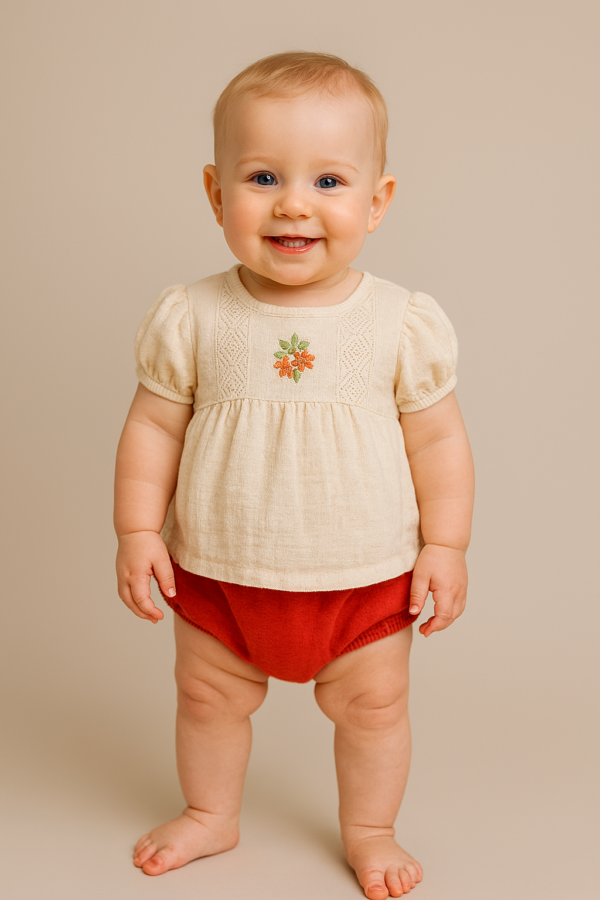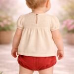 Kız Bebek Krem Renk Ön Kısmı Çiçek Işlemeli Kısa Kollu Şortlu Keten Takım