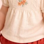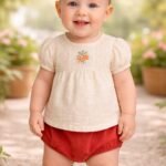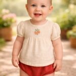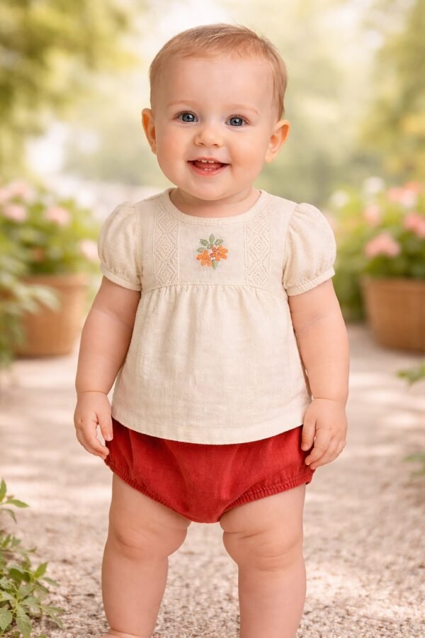 Kız Bebek Krem Renk Ön Kısmı Çiçek Işlemeli Kısa Kollu Şortlu Keten Takım nasıl bir kumaştan üretilmiştir?