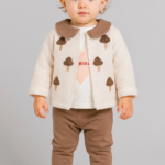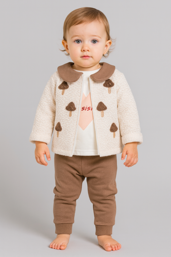 Zarif Kapitone Ceket: Krem rengi kapitone dokulu hırka, kahverengi kontrast bebe yakası ve ön kısmındaki üç adet sevimli mantar aplikesi ile görsel bir bütünlük sağlar.