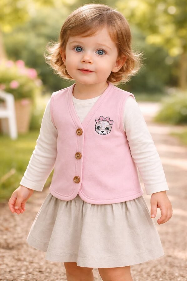Kız bebekler için tasarlanmış şık ve rahat panda kafa baskılı pembe yelek. 12-18 ay, 3-6 ay, 6-9 ay ve 9-12 ay beden seçenekleriyle çeşitli boylarda sunulur. Günlük kullanıma uygun, yumuşak ve dayanıklı yapısıyla hareket özgürlüğü sağlar. Ahşap düğmeli kapatma detayları kolay giydirme imkanı sunar.