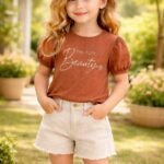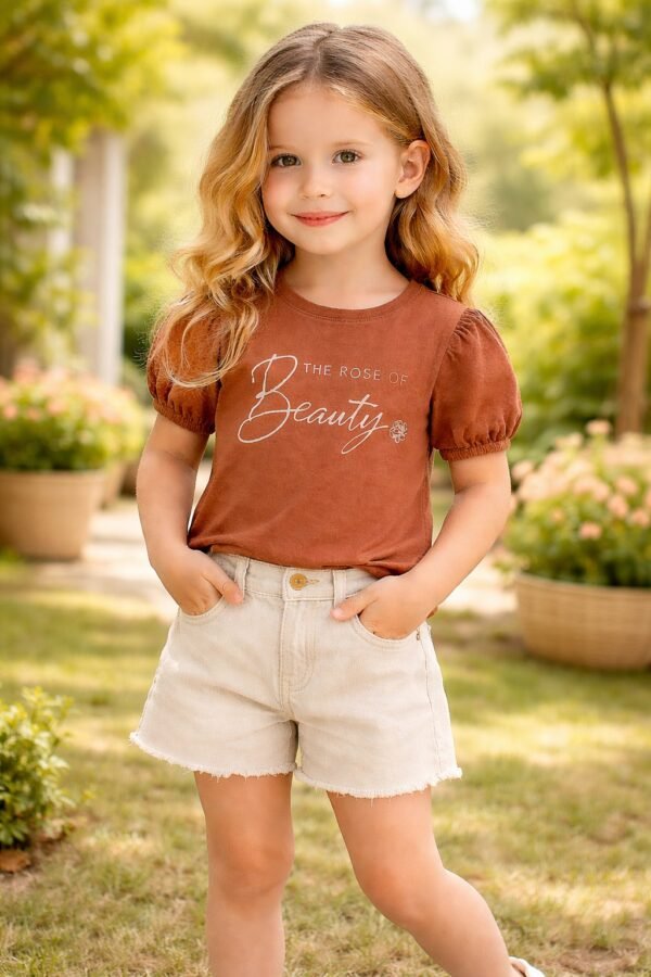 Kız Çocuk Beauty Yazılı – Kısa Kol Bisiklet Yaka – Tişört – Kot Şortlu Takım