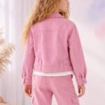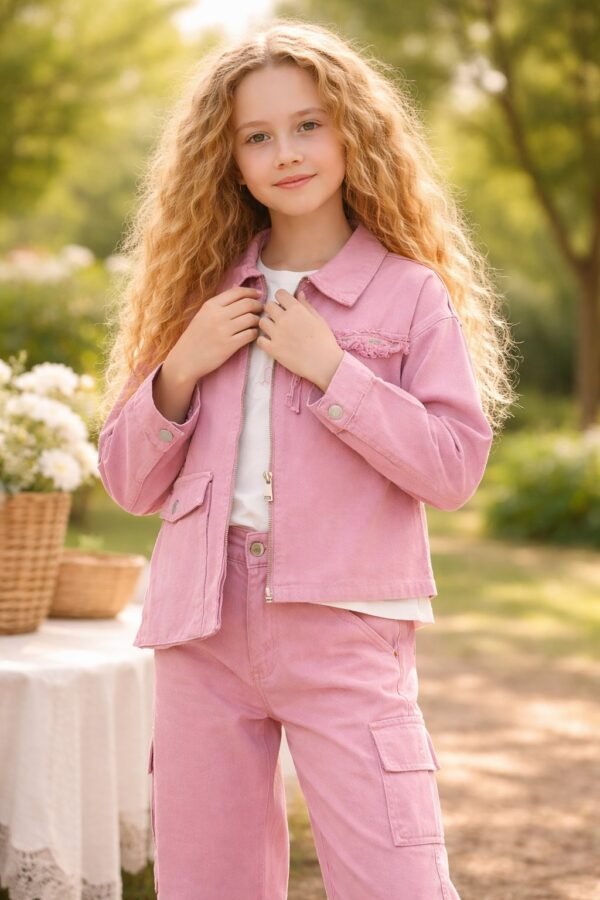 Kız Çocuk önden fermuarlı- cep detaylı - pembe renk keten ceket- kısakol tişört -kargo cepli kot pantolonlu 3lü takım