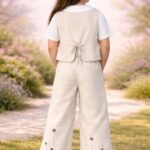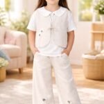 Kız Çocuk Çiçek Nakışlı Keten Bağcıklı Yelek Bol Paça Pantolon Takım