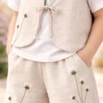 Kız Çocuk Çiçek Nakışlı Keten Bağcıklı Yelek Bol Paça Pantolon Takım nasıl bir kumaştan üretilmiştir?