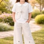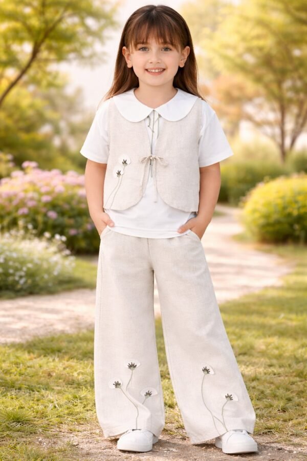 Kız çocuk çiçek nakışlı - keten- bağcıklı - yelek- kısa kol - bebe yaka- çiçek dalı nakışlı - tişört- beli lastikli- bol paça -paça kısmı çiçek nakışlı pantolon takım