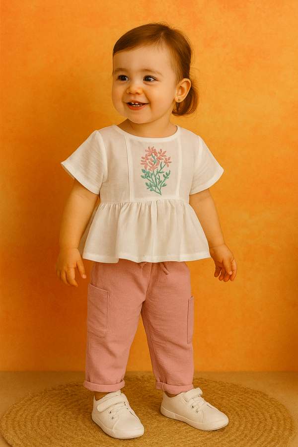 Kız Çocuk çiçek nakışlı müslin kumaşlı gömlek- beli lastikli- yandan cepli uzun bol paça pantolunlu takım