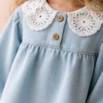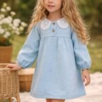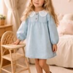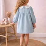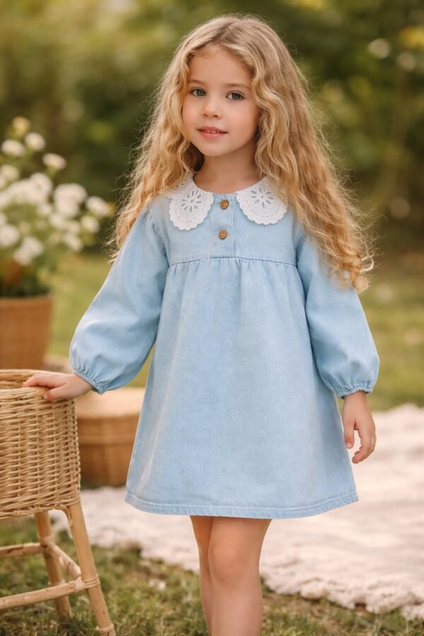 Kız Çocuk Dantel Yakalı – Düğmeli – Mavi Renk Kot Elbise