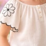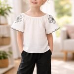 Kız Çocuk Ekru Renk – Geniş Yaka – Kolları Çiçek Nakışlı -pantolunlu Takım