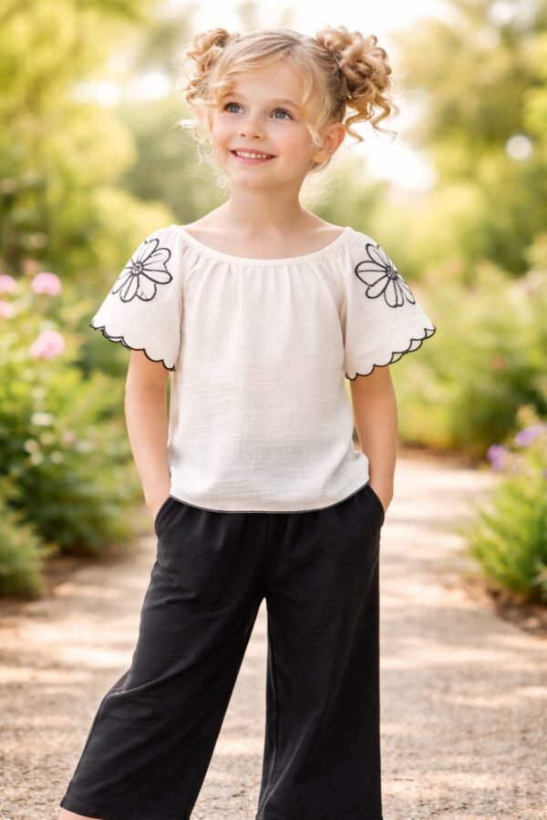 Kız Çocuk ekru renk - geniş yaka - kolları çiçek nakışlı - siyahrenk pantolunlu takım