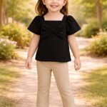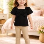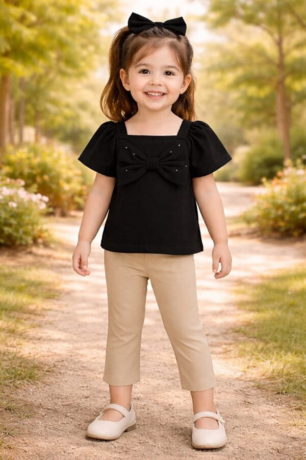 Kız Çocuk fiyonk detaylı siyah renk kısa kollu tişörtlü taytlı takım