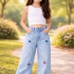 Kız Çocuk fiyonk işlemeli garson boy bol paçalı kot pantolon