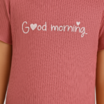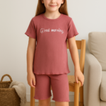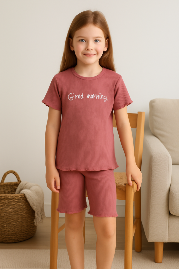 Kız Çocuk good morninig yazılı fitilli kısa kollu pamuklu pudra renk şort takım