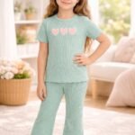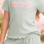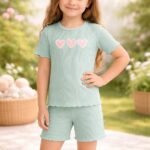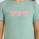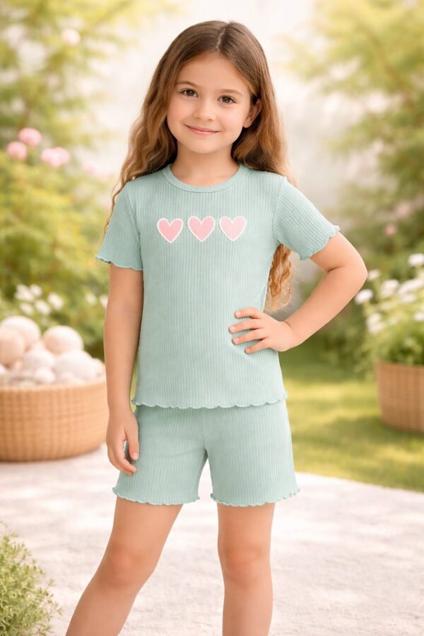 Kız Çocuk kalp baskılı fitilli su yeşili renkli şortlu kısakollu takım
