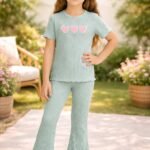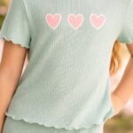 Kız Çocuk kalp baskılı mint yeşili renkli fitilli kısa kollu takım