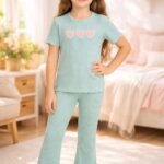 Kız Çocuk Kalp Baskılı Mint Yeşili Renkli Fitilli Kısa Kollu Takım nasıl bir kumaştan üretilmiştir?
