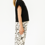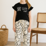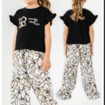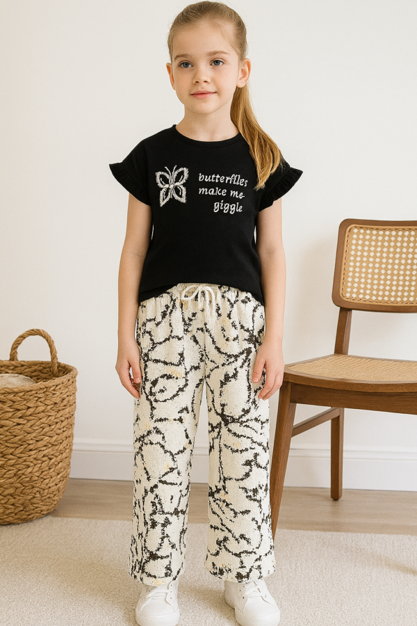 Kız Çocuk siyah renk - kelebek baskılı -kolları fırfırlı tişörtlü- karışık desenli - bel kısmı lastikli - bol paçalı pantolonlu tk.